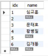 다음과 같이 name이라는 이름의 컬럼에 NULL 값이 몇 개 들어 있는 test라는 테이블이 있다고 가정하겠습니다.