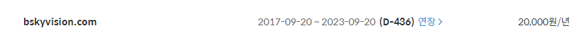 2022년 7월 11일 기준 가비아에서 구입한 bskyvision.com 도메인을 사용한지 어느덧 6년차가 되었네요. 2023년 9월까지 기간을 연장해놓은 상태입니다.