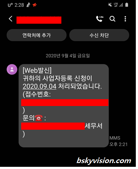 신청 후 얼마 지나지 않아(저의 경우는 신청 당일에) 세무서에서 사업자등록 신청이 처리되었다고 다음과 같은 문자를 보내왔습니다.