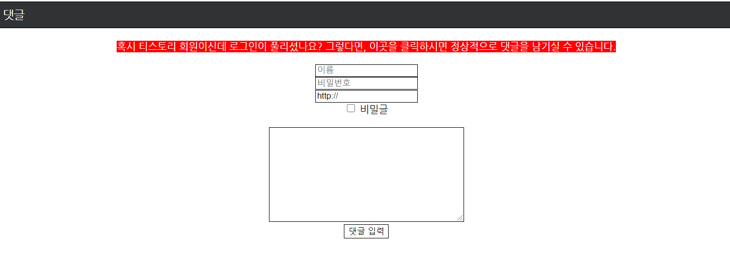 하지만, 단점은 댓글을 남기고자 하는 티스토리 유저께서 저 링크를 꼭 한 번 클릭해주셔야지만, 로그인 풀림 현상을 해결할 수 있다는 것입니다. 그 과정이 귀찮아서 댓글을 남기는 것을 주저하는 분들이 분명 계실 것입니다. 하지만, 지금으로서는 이것이 최선인 듯합니다. 그래서 저는 현재 이 방법을 선택해서 적용해놓은 상태입니다. 댓글창 위를 보시면 "혹시 티스토리 회원이신데 로그인이 풀리셨나요? 그렇다면, 이곳을 클릭하시면 정상적으로 댓글을 남기실 수 있습니다"라는 메세지가 떠있는 것을 보실 수 있으실 것입니다.