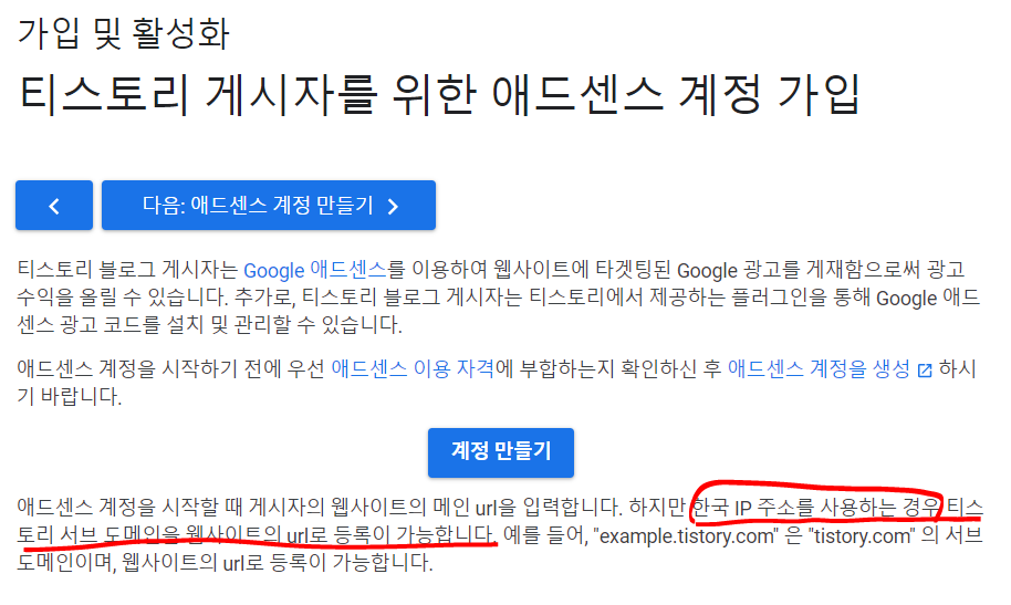 "한국 IP 주소를 사용하는 경우 티스토리 서브 도메인을 웹사이트의 url로 등록이 가능합니다."