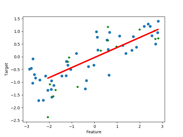 그럼 간단한 예제를 하나 풀어보겠습니다. 선형 회귀로 해결할 수 있을 것 같은 데이터를 불러와서, 그 중 랜덤하게 75%의 샘플을 선택해서 훈련셋으로 나머지 25%는 테스트셋으로 분리해줍니다. 그 다음에 훈련셋을 이용해서 선형 회귀 모델을 훈련함으로 최적의 a와 b를 구합니다. 그 다음에 y = ax + b(최적의 a와 b를 알게 된 상태)함수에 테스트셋의 각 샘플들의 특성값을 x에 대입시켜줍니다. 그러면 각 샘플의 타겟값에 대한 예측값을 알게 됩니다. 타겟값과 예측값의 상관성을 결정계수를 통해 평가합니다. 결정계수는 1에 가까울수록 예측이 정확하다는 의미를 갖습니다.