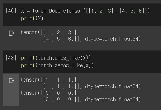 ones_like야, "입력 텐서와 동일한 모양의 텐서를 만들어주는데, 1로 채워줘."