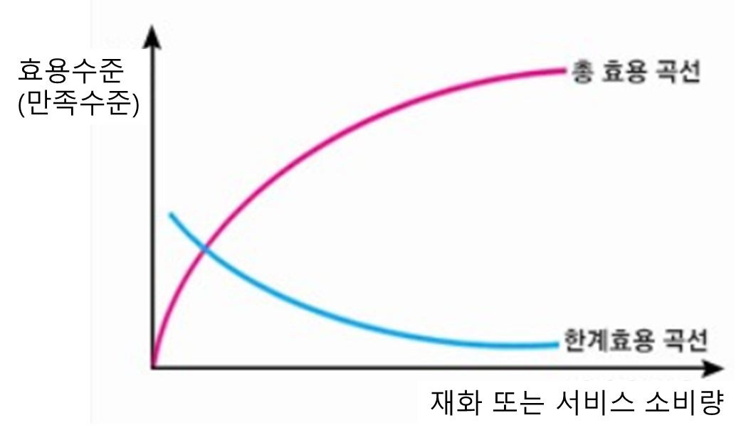 소비량이 늘어감에 따라 총 만족도가 계속 증가하는 것이 아니라 늘어나다가 일정한 수준에 수렴하게 된다. 한계효용이 점차 줄어들었기 때문이다. 다른 말로 새로운 소비로 인한 추가적인 만족도가 점차 감소했기 때문이다.