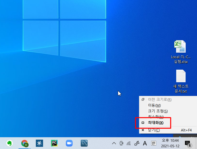 모니터를 하나 더 연결해서 듀얼 모니터로 사용하는 경우에 종종 실행한 프로그램의 창이 안 보일 때가 있습니다. 당황스럽죠. 이때는 alt + space 를 해주면 다음과 같이 그 프로그램의 화면의 크기를 조정할 수 있는 메뉴가 뜰 겁니다.