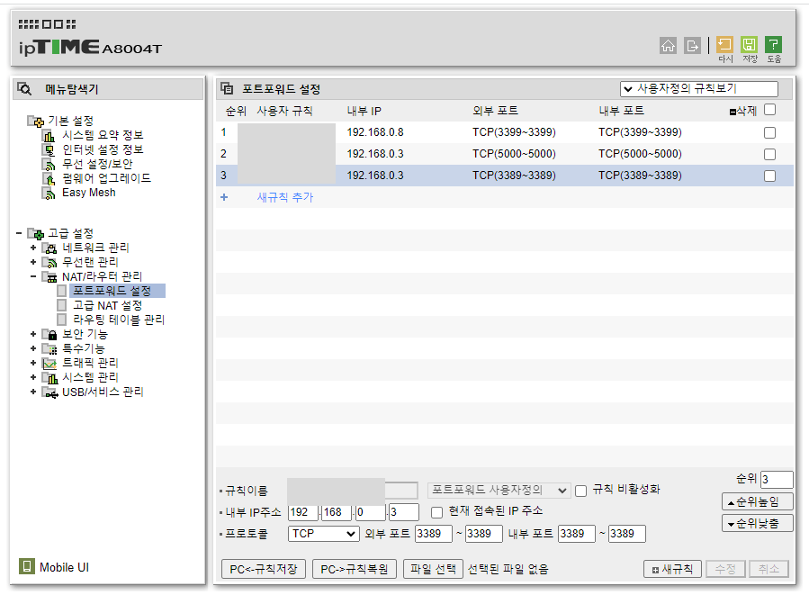 로그인 하신 후에 [고급 설정] - [NAT/라우터 설정] - [포트포워드 설정]에 가셔서 아래와 같이 새규칙을 추가해주면 됩니다. 규칙이름은 알아서 기입해주시면 되고, 내부 IP주소는 [현재 접속된 IP 주소] 체크박스를 체크하시면 저절로 기입되고, 외부포트 및 내부포트는 모두 3389로 적어줍니다.