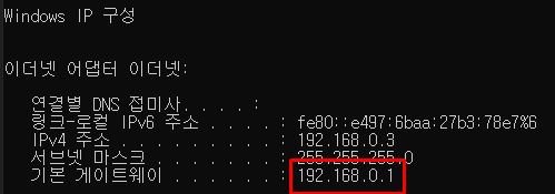 3389를 사용할 수 있는 상황이라면 공유기 설정 페이지에 가서 해당 PC의 내부 IP주소에 대해 3389 포트를 열어줘야 합니다. iptime 공유기를 사용하고 있다면, 웹 브라우저의 주소창에 192.168.0.1을 입력하시면 공유기 설정 페이지로 이동합니다. LG 유플러스, KT 어떤 곳의 공유기를 사용하느냐에 따라 설정 페이지에 접속하는 주소는 모두 다릅니다. 보통 명령 프롬프트에서 ipconfig를 치신 후에 가장 하단에 있는 [이더넷(또는 무선 LAN) 어댑터 Wi-Fi] - [기본 게이트웨이]에 나오는 주소를 치시면 됩니다.