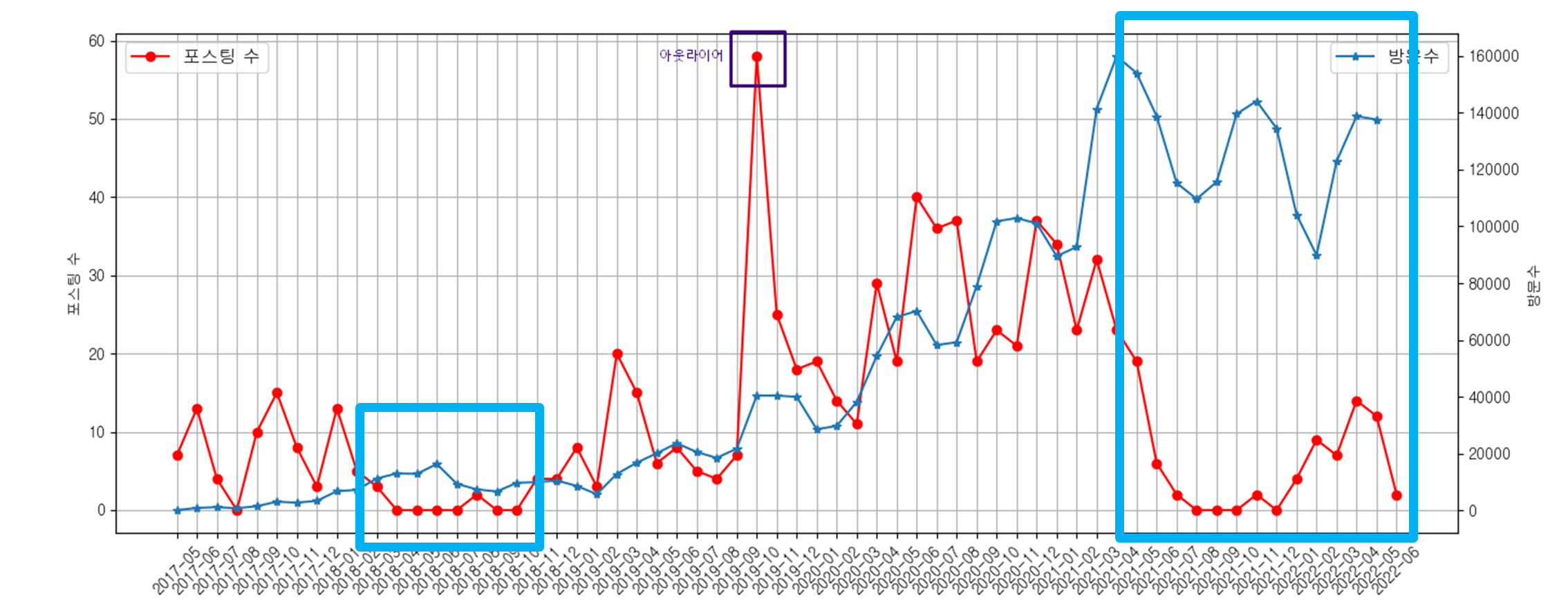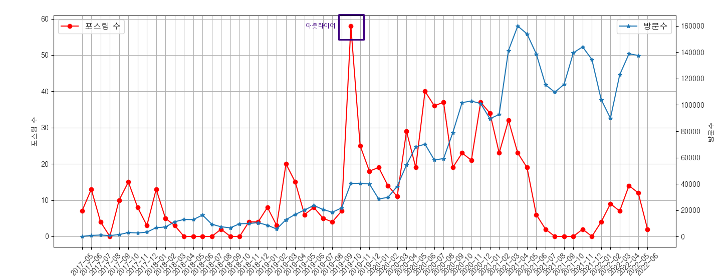 ax1.legend(labels=['포스팅 수'], loc='upper left', fontsize=12)