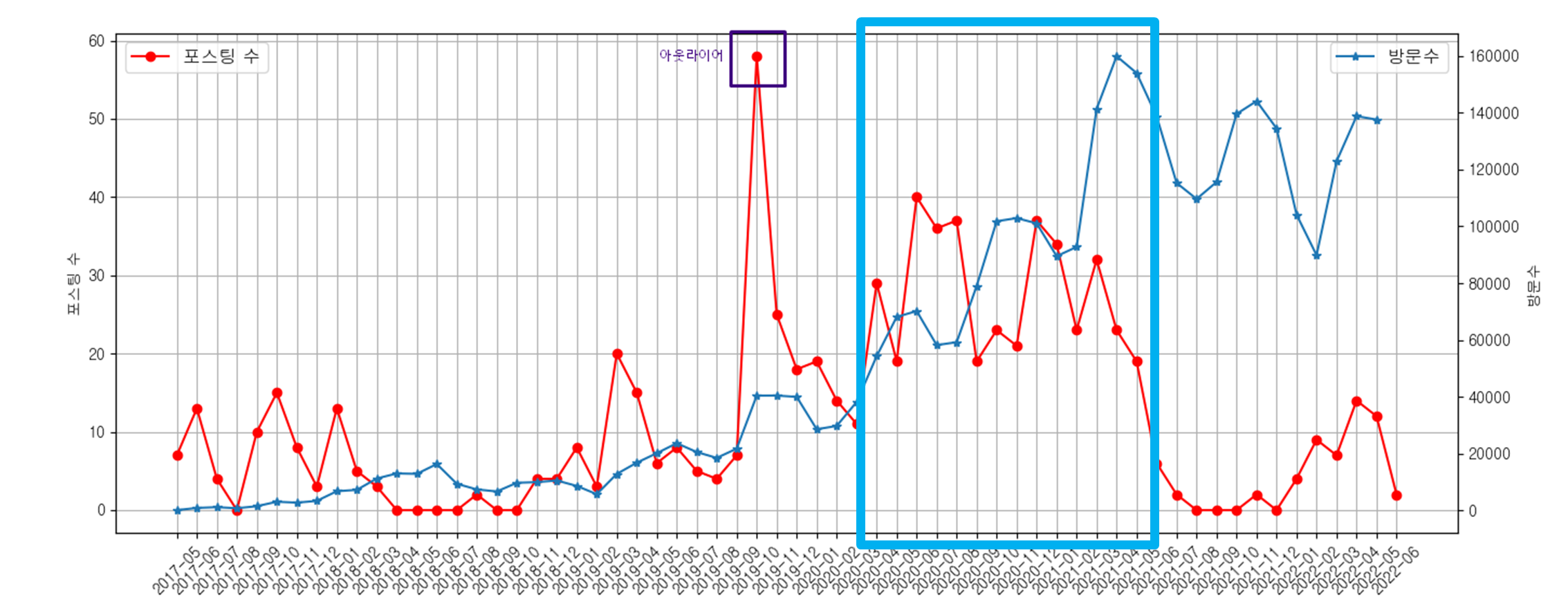 제가 2019년 9월 포스팅 수를 아웃라이어라고 표시해 놓은 이유는 독후감 관련해서 포스팅했던 것을 네이버 블로그로 옮기려고 지웠다가 다시 포스팅을 해서 포스팅 횟수가 매우 많았던 달이기 때문입니다. 2019년 9월 포스팅 수는 이상치(outlier)로 생각하는 것이 좋을 것 같습니다.