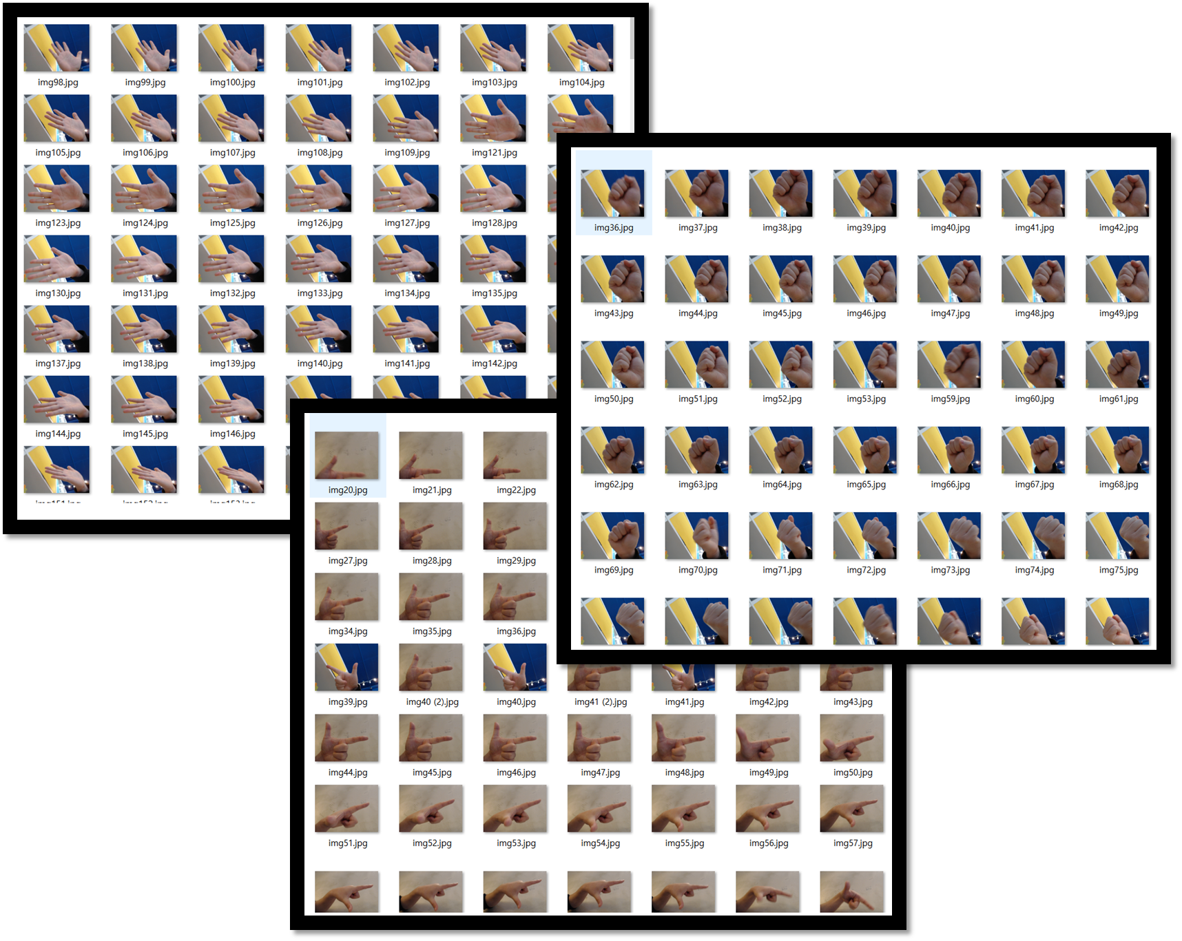 위 코드를 실행해서 얻은 이미지들 중에 만족스럽지 않은 이미지들은 삭제했고, 결과적으로 저는 394장의 바위 이미지, 461장의 가위 이미지, 413장의 보 이미지를 가진 가위바위보 데이터셋을 만들었습니다.