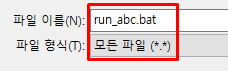 다 작성하신 후에는 다른 이름으로 저장을 해주셔야 하는데, 파일 형식을 모든 파일로 변경하신 후에 파일 이름의 확장자를 .bat으로 합니다.