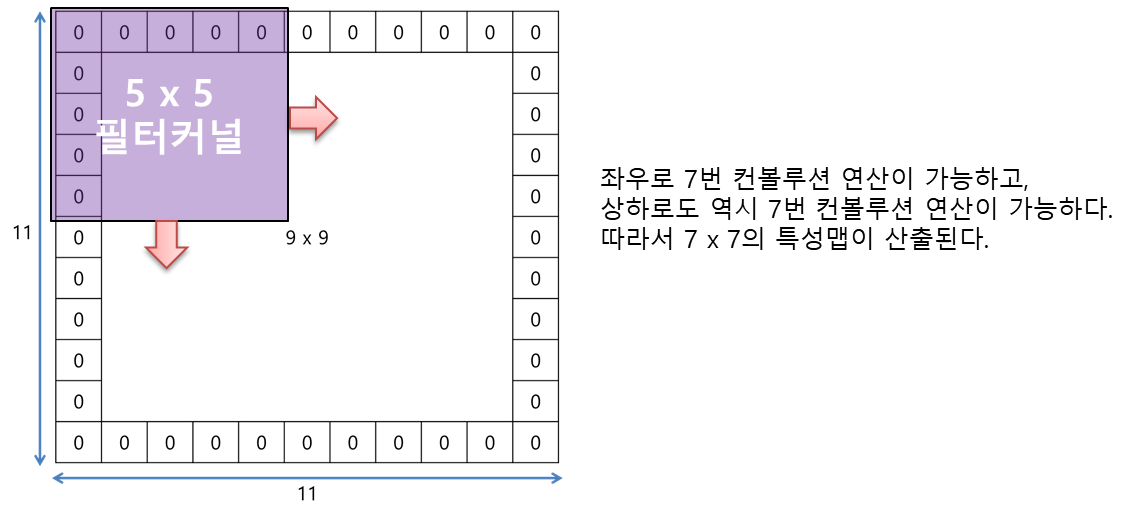 5 x 5 필터커널은 우로 이동하면서 총 7번의 컨볼루션 연산을 진행하고, 또한 아래로 이동하면서 총 7번의 컨볼루션 연산을 진행한다. 따라서 7 x 7 특성맵이 산출되는 것이다.