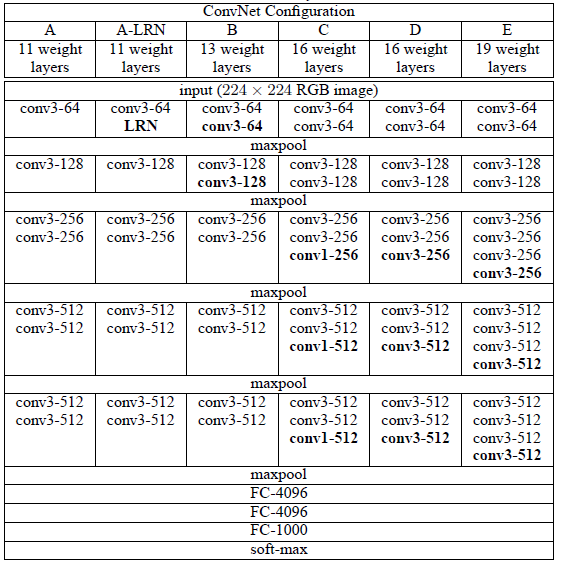 VGG 연구팀은 original 논문에서 총 6개의 구조(A, A-LRN, B, C, D, E)를 만들어 성능을 비교했다. 여러 구조를 만든 이유는 기본적으로 깊이의 따른 성능 변화를 비교하기 위함이다. 이중 D 구조가 VGG16이고 E 구조가 VGG19라고 보면 된다.