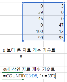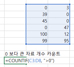 해당 범위에 있는 데이터 중 0보다 큰 데이터의 개수를 구하고 싶다면 다음과 같이 함수식을 완성하시면 됩니다.