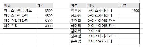 위와 같이 수식을 적용하면 아이스카페라떼의 가격이 해당 셀에 들어갑니다.