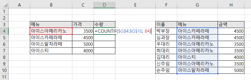 위와 같이 countif 함수를 활용하여 수식을 적용하면 아이스아메리카노의 수량이 잘 세어집니다.