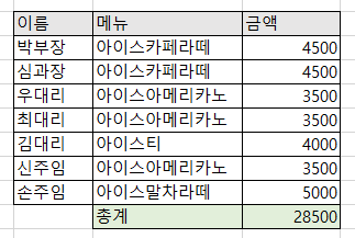 부장님이 부하 직원들에게 커피를 쏘기로 해서 손주임이 메뉴를 주문 받는 상황이라고 가정하겠습니다. 손주임은 엑셀을 활용하여 주문 내역을 정리합니다.