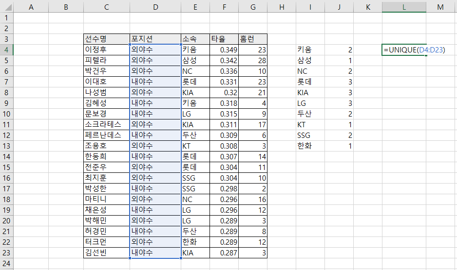 먼저 빈 셀에 unique 함수를 사용하여 소속팀의 고유값 리스트를 구합니다.