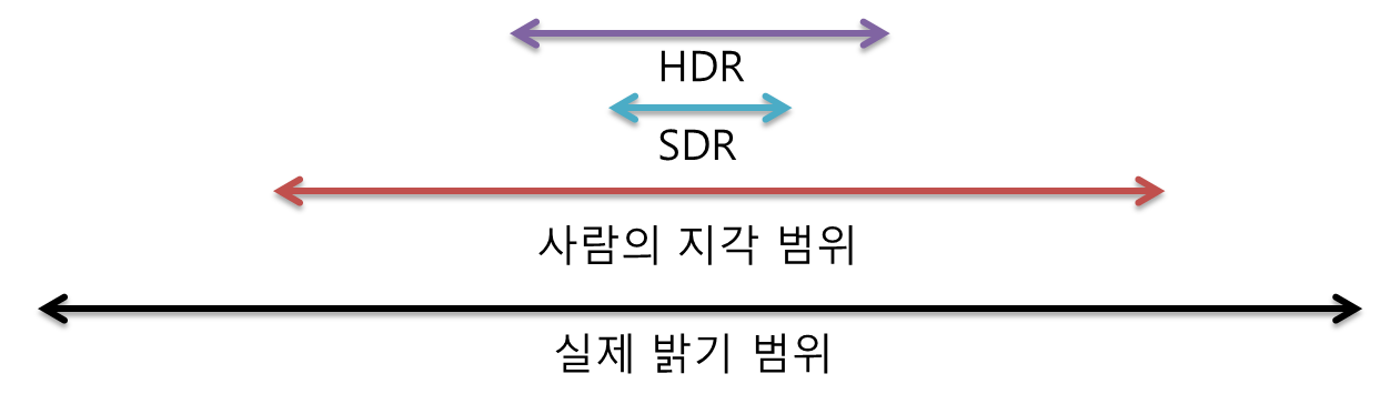 디지털이미지는 일반적으로 red, green, blue (RGB) 3채널로 구성되어 있고, 각 채널당 8비트로 표현되어 있습니다. R, G, B 채널 각각 0-255의 밝기로 표현할 수 있는 것이죠. 이러한 디지털이미지를 SDR(standard dynamic range) 이미지라고 부릅니다. 그러나 SDR 이미지의 경우 구현할 수 있는 밝기의 범위가 좁기 때문에 어두운 부분이 제대로 표현되지 않거나, 밝은 부분이 제대로 표현이 되지 않을 때가 많습니다. 결과적으로 우리가 눈으로 직접 보는 장면과 그것을 담은 디지털이미지 사이에는 큰 차이가 있습니다.