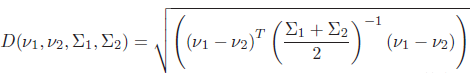 이제 마지막으로 깨끗한 이미지의 품질을 대표하는 $\nu_1$, $\Sigma_1$과 테스트 이미지의 품질을 대표하는 $\nu_2$, $\Sigma_2$의 유사도를 계산해서 테스트 이미지의 품질을 예측합니다. 유사도 또는 거리를 계산한다고 생각하시면 됩니다. 다음과 같은 공식으로 그 유사도 또는 거리를 구할 수 있습니다.