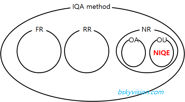 기본적으로 이미지품질평가(image quality assessment, IQA) 방법은 FR(full-reference), RR(reduced-reference), NR(no-reference)로 나눕니다. FR의 경우 이미지의 품질을 평가하기 위해 그 이미지의 깨끗한(pristine) 원본 이미지를 필요로 하는 것을 의미하고, RR의 경우는 원본 이미지의 일부 정보를 필요로 하는 것을 의미합니다. 반면 NR은 원본 이미지를 참조하는 것 없이 품질평가가 가능한 방법을 의미합니다.