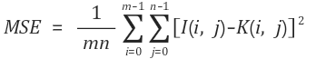 여기서 $MAX_I$는 해당 영상의 최댓값으로서, 8비트 그레이 스케일 영상의 경우는 255가 된다. 또한 MSE는 평균제곱오차로써 다음과 같이 계산할 수 있다.