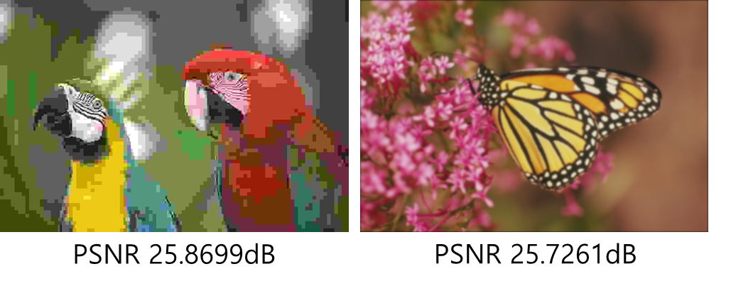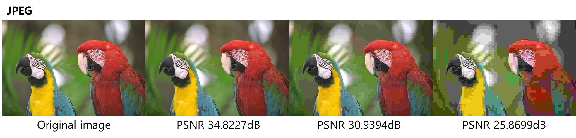 JPEG 압축 손실된 이미지들의 PSNR을 보면 압축률이 클수록 PSNR도 작아진 것을 확인할 수 있다.
