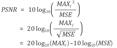 여기서 I는 m x n 사이즈의 그레이스케일 이미지이고, K는 I에 잡음이 포함된 이미지, 즉 왜곡된 이미지를 의미한다. 공식1의 분모에 MSE가 있으므로, MSE(평균제곱오차)가 작을수록 더 큰 PSNR을 갖게 되는 것이다. 따라서 품질이 좋은 이미지는 비교적 큰 PSNR을 가질 것이고, 품질이 나쁜 이미지는 비교적 작은 PSNR을 가질 것이다.
