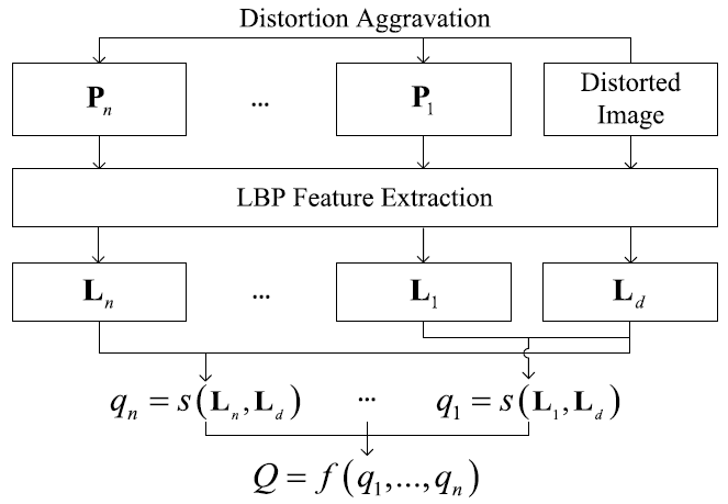 따라서 왜곡 이미지와 20개의 PRI에서 LBP(local binary pattern)를 계산한다. 그리고 왜곡 이미지의 LBP 특성맵과 20개 PRI의 LBP 특성맵의 유사도를 비교함으로써 총 20개의 값을 얻는다. 그 20개의 값으로 SVR을 훈련시킴으로 최종 품질 점수를 얻는다. 아래 BMPRI의 프레임워크를 참고하자.