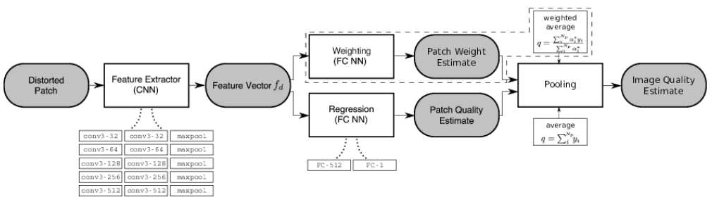 Jie Li 등은 각 로컬 이미지 패치의 품질 점수를 CNN을 통해 예측했습니다. 또한 그래프 기반 이미지 분할 알고리즘으로 이미지들을 분할한 후에, 분할된 이미지의 Prewitt gradient 맵을 계산했습니다. gradient 크기를 패치에 따라 평균낸 것을 가중치로 삼아서 로컬 품질 점수들을 종합함으로 최종 품질 점수를 구했습니다.
