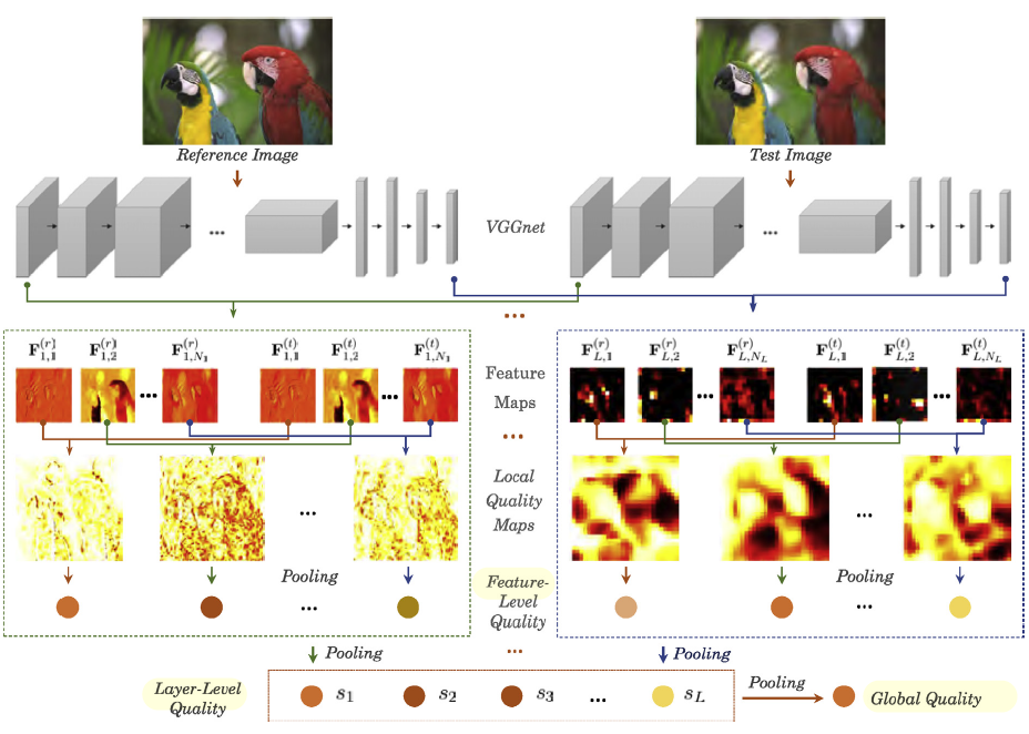 Fei Gao 등은 이미지 분류 과제를 위해 미리 훈련된 딥러닝 모델을 특성맵 도출에 사용하는 FR IQA 모델을 제안했습니다. 미리 훈련된 VGG16 모델에 원본 이미지와 왜곡 이미지를 각각 입력해서 아주 많은 수의 원본 특성맵들과 왜곡 특성맵들을 얻었습니다. 그 다음에 원본 특성맵들과 그에 해당하는 왜곡 특성맵들의 유사도를 SSIM을 이용해서 산출한 다음에 그 유사도들을 평균냄으로 이미지에 대한 품질 점수를 예측했습니다.