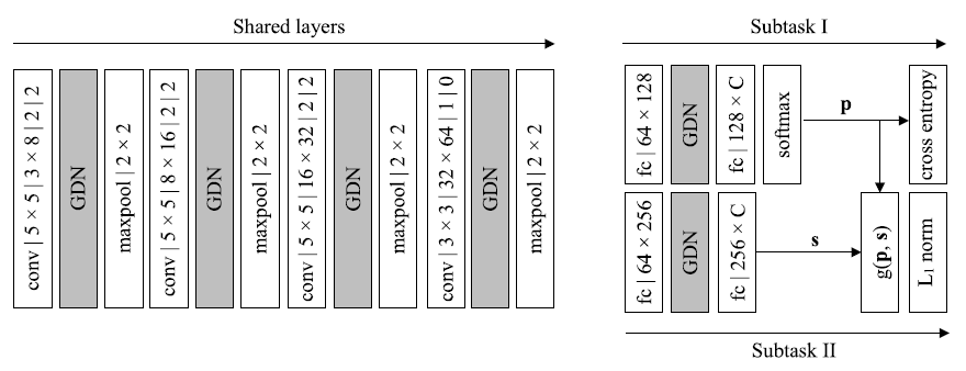 Kede Ma 등은 이미지 내 존재하는 왜곡의 유형과 정도를 동시에 예측해내는 NR IQA 모델을 제안했습니다. 왜곡 이미지는 4층의 Conv 레이어를 거친 후에 먼저 서브네트워크1에 입력되어 왜곡의 유형을 예측합니다. 또한 4층의 Conv 레이어를 거쳐 얻게된 특성정보는 서브네트워크1에서 얻은 왜곡 유형과 함께 서브네트워크2에 입력되고, 최종적으로 품질 점수가 예측됩니다.
