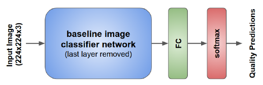 Simone Bianco 등은 ImageNet 데이터셋과 Place 데이터셋을 합친 데이터로 미리 훈련된 CNN 모델을 이미지품질 데이터셋을 이용해서 fine-tuning한 모델을 이용해서 특성을 도출했습니다. 전이학습(transfer learning)을 이용한 것이죠. fine-tuning 과정에서 이미지 품질 점수를 5개의 카테고리(bad, poor, fair, good, excellent)로 분할해서 분류기를 훈련시키는 방식으로 모델을 훈련시켰습니다. 도출된 특성은 SVR(support vector regressor)을 훈련시키는데 사용되고, 최종적으로 품질 점수가 예측됩니다.