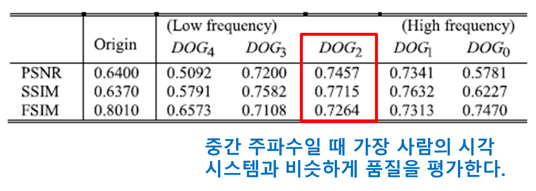 이 알고리즘에서 흥미로운 것은 DoG 엣지 맵들에서 얻은 품질 점수가 대비감도함수(contrast sensitivity function, CSF)와 비슷한 특성을 지닌다는 것이다. 즉 사람의 시각 시스템은 고주파정보와 저주파정보보다는 중간 정도의 주파수에 더 민감하다는 것이 DoG-SSIM에서도 확인된다. DoG 맵들의 비교를 통해 얻은 5개의 각각의 품질 점수와 경험 품질에 관한 레이블인 MOS(mean opinion score)간의 상관계수 값을 보면 중간 정도의 주파수 때 가장 높은 상관계수값을 지님을 알 수 있다(아래 표 참고).