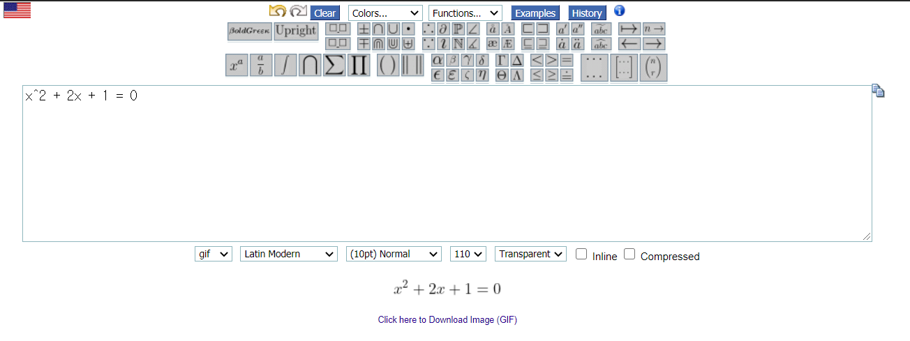 그러면 인라인 방식부터 살펴보겠습니다. 넣고 싶은 수식을 LaTeX 문법에 맞게 만듭니다. 저는 보통 링크 건 사이트를 이용해서 수식을 만듭니다. LaTeX 수식을 쉽게 만들수 있게 도와주는 웹사이트입니다. 저는 다음과 같은 수식을 만들었습니다.