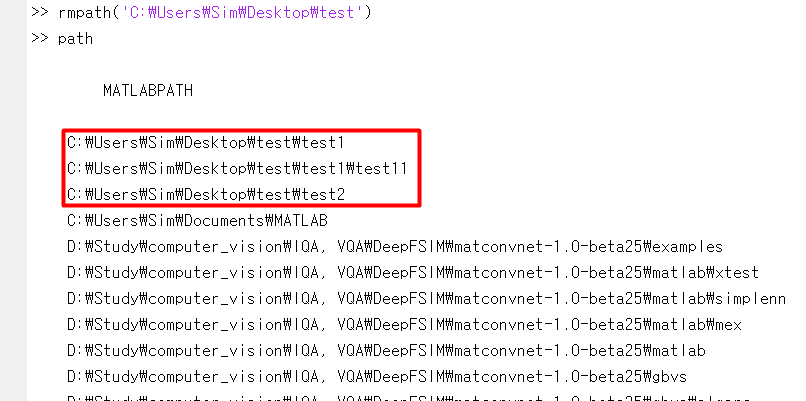 마지막으로, 추가된 경로를 제거해보도록 하겠습니다. 더이상 그 경로의 도구들이 필요없다면, 경로를 제거해도 되겠죠? 제거할 때는 rmpath() 함수를 사용합니다. test 폴더 내 하위 폴더들에 대한 모든 경로를 제거하려면 마찬가지로 genpath() 함수를 곁들여줘야 합니다. 그냥 rmpath('C:\Users\Sim\Desktop\test')를 명령하면, 다음과 같이 딱 그 경로만 제거되고, 하위 폴더들에 대한 경로는 제거되지 않습니다.