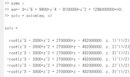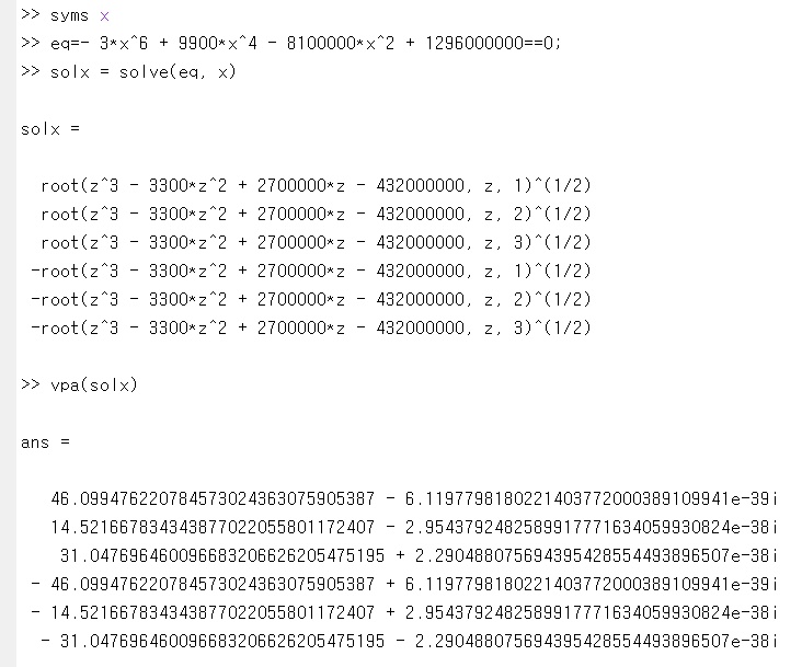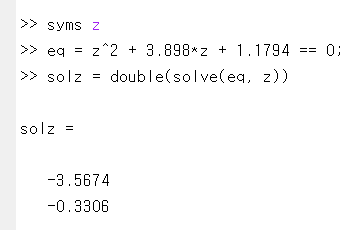 물론 그 유명한 근의 공식을 사용하면 누구든 풀 수 있습니다. 단지 오래 걸릴 뿐이죠. 대신 매트랩에게 맡겨보겠습니다.