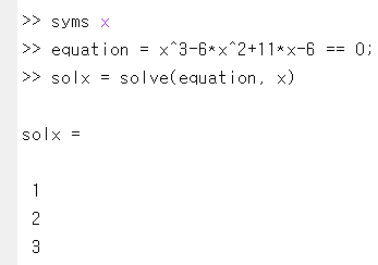 간단한 예를 하나 더 들겠습니다. $x^3 - 6x^2 + 11x - 6 =0$의 해는 무엇일까요? 이 방정식 역시 그렇게 해를 구하기가 어려운 것은 아니지만, 매트랩을 통해 풀어보겠습니다.