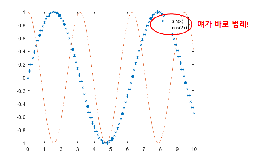 범례 덕분에 우리는 파란색 별표로 그려진 그래프가 sin(x)의 그래프고, 빨간색 점선으로 그려진 그래프가 cos(2x)의 그래프인 것을 한 눈에 알 수 있습니다.