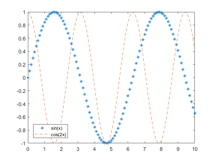 legend('sin(x)', 'cos(2x)', 'Location', 'southwest');