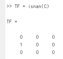 어떤 행렬끼리 ./ 연산, 즉 동일한 행과 열에 위치하는 요소끼리 나누는 연산을 하는 중에 NaN이 발생했다. 그러면 행렬 C를 isnan 함수에 입력해주면 다음과 같은 결과가 출력된다.
