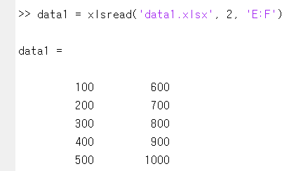 >> data1 = xlsread('data1.xlsx', 2, 'E:F')