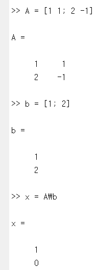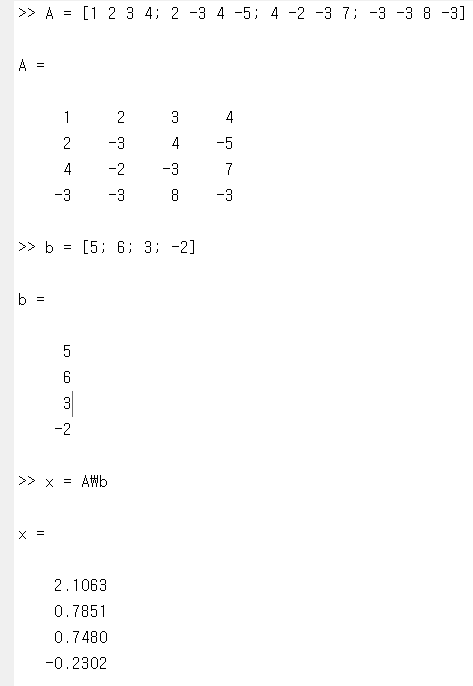 일단 방정식의 왼편에 있는 모든 계수들로 하나의 행렬 A을 만들어줍니다. 그리고 오른편에 있는 수들로 하나의 행렬 b을 만들어줍니다. 그리고 x = A\b 이렇게 간단한 코드만 입력해주면 우리가 원하는 해를 바로 딱 출력해줍니다.