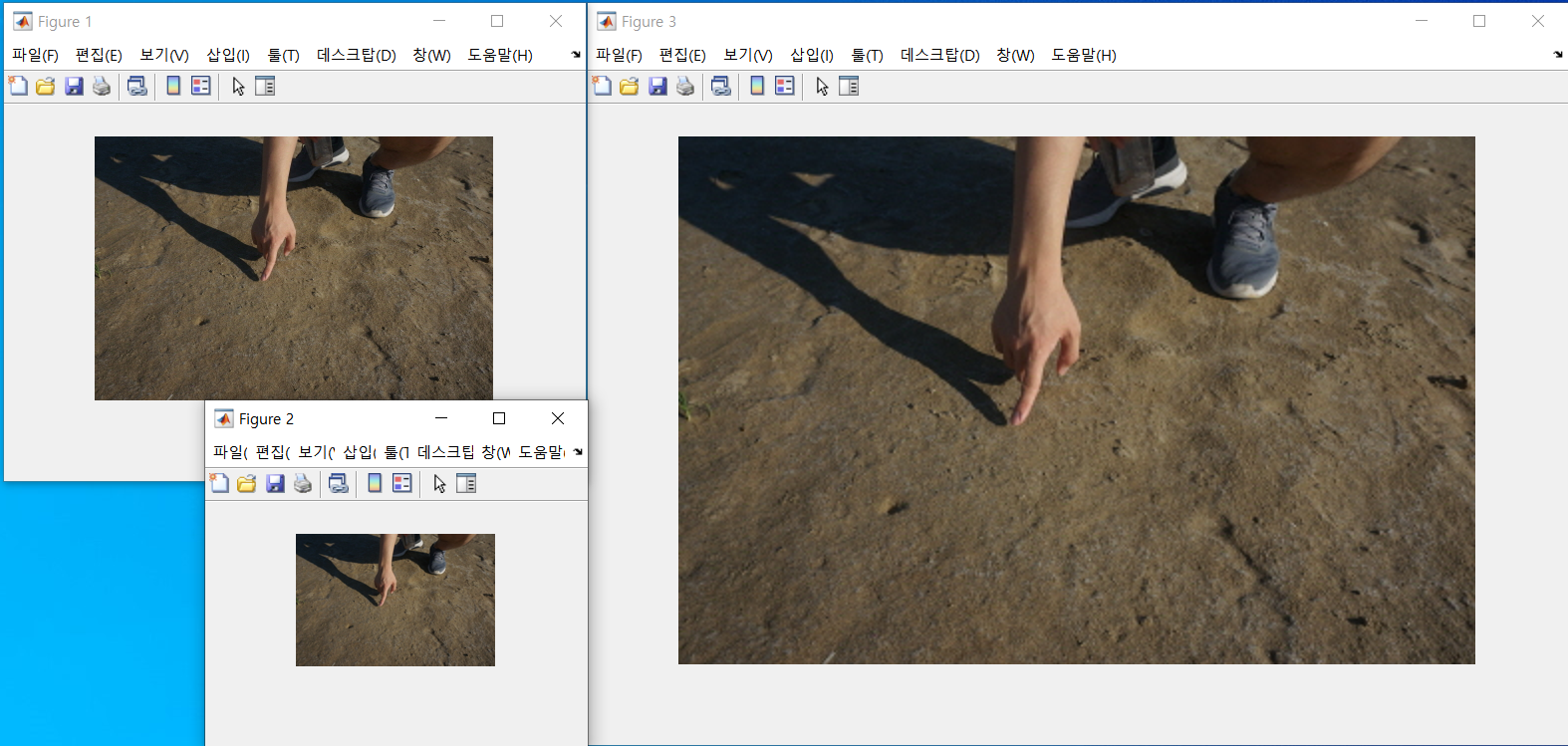 코드를 실행하시면 다음과 같은 결과가 나타납니다. 2배만큼 잘 축소되고, 또 2배만큼 잘 확대되었죠?