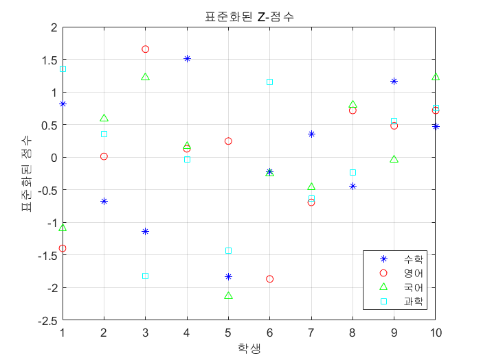 결과적으로 표준화된 값들의 평균은 0이고 표준편차는 1이 된다. 이때 사용할 수 있는 매틀랩 함수는 바로 zscore이다. 표준화를 해주면 난이도가 다른 각 과목의 점수들을 상대적으로 평가할 수 있게 된다.