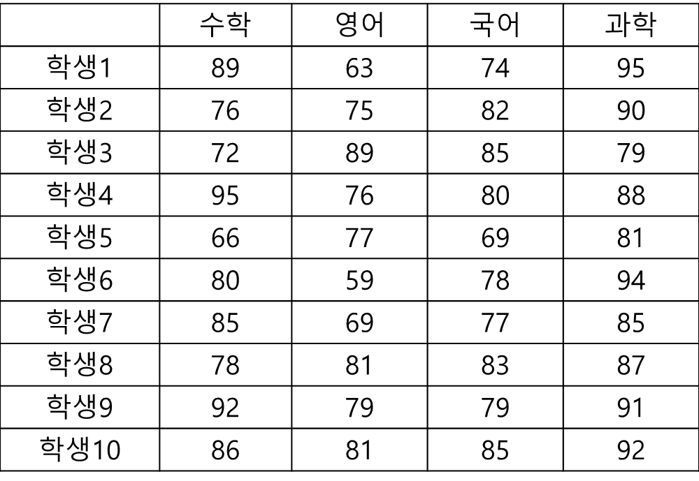 10명의 중학생이 있다. 이들의 수학, 영어, 국어, 과학 시험 점수는 다음과 같다.