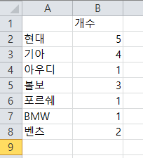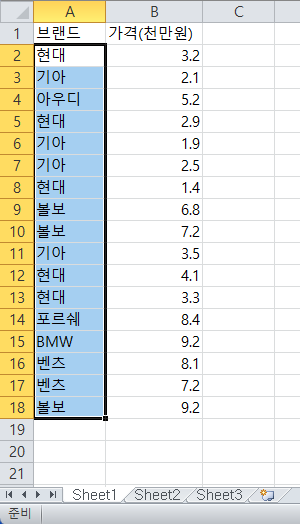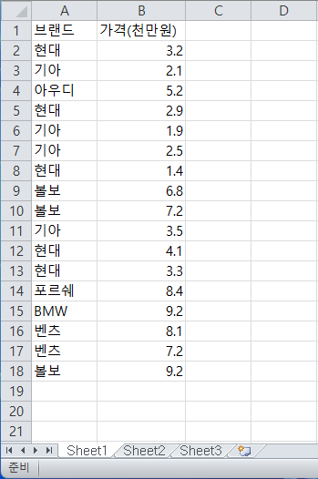 Sheet1에 다음과 같이 우리 동네에 있는 자동차 브랜드와 가격(천만원) 정보가 담긴 엑셀 파일이 있다고 가정해보겠습니다.