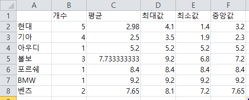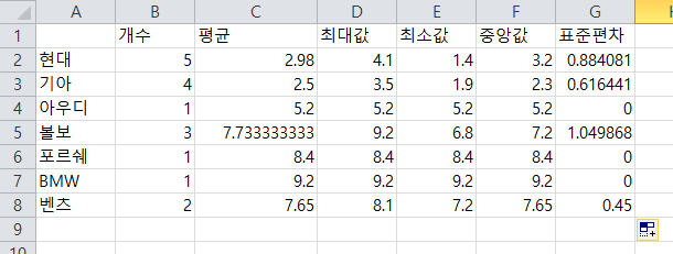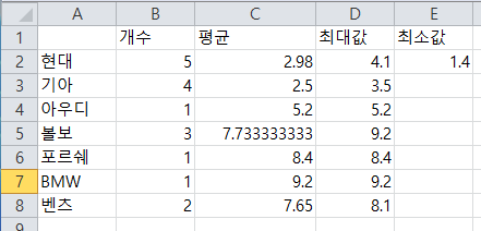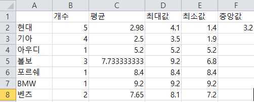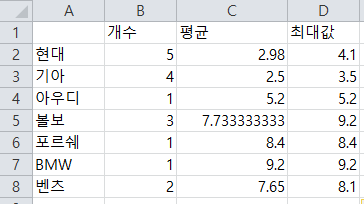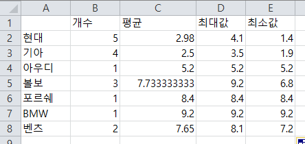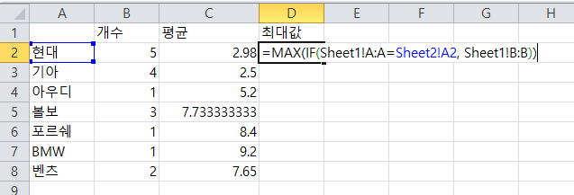 나머지 차량 브랜드의 최대값도 구해지도록 D2 셀을 아래로 드래그하겠습니다.