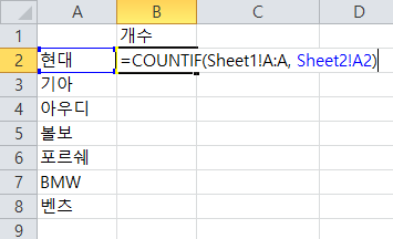 3. COUNTIF 함수를 사용하여 Sheet1에서 브랜드가 현대로 되어 있는 행의 개수를 구합니다. Sheet1에서 A열에서 Sheet2의 A2 셀(현대)과 같은 값을 갖는 것의 개수를 파악하는 것이므로 다음과 같이 수식을 작성합니다.