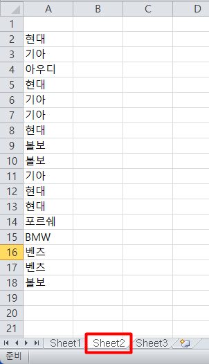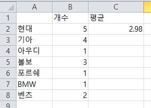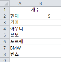 기아, 아우디, 볼보 등의 개수는 이미 수식이 적용된 B2 셀을 클릭한 후에 쭉 아래로 드래그하면 됩니다.